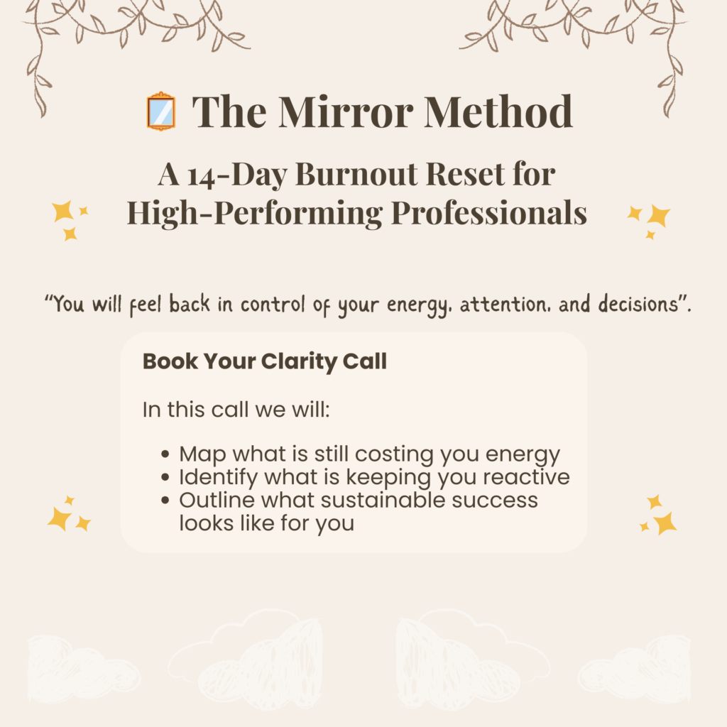 A 14-Day Burnout Reset for High-Performing Professionals The Mirror Method helps you see what is draining you.A Clarity Call helps